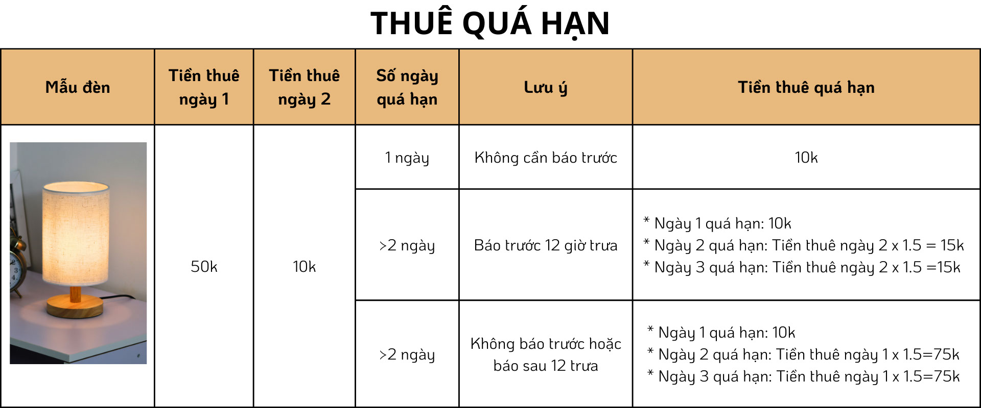 tiền thuê thêm 1 ngày = tiền thuê ngày 1 x1.5