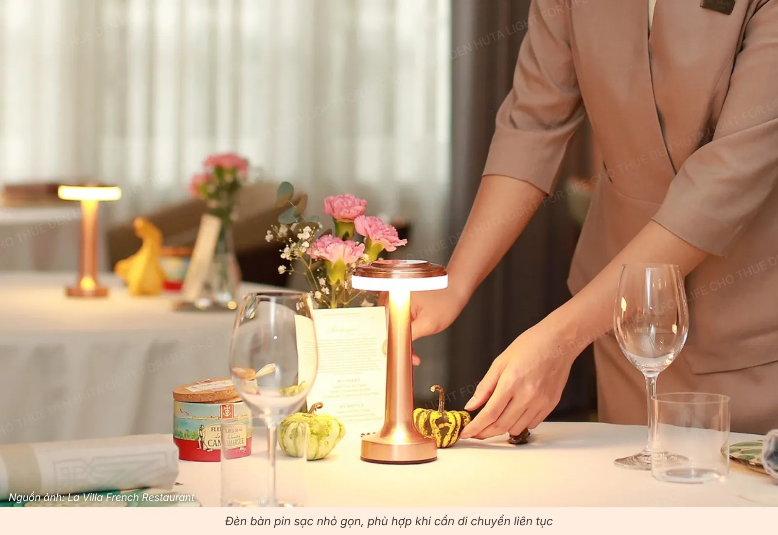 - Trang trí sự kiện, tiệc tùng: Đèn bàn pin sạc là lựa chọn phù hợp cho các không gian tiệc nhờ thiết kế nhỏ gọn, không cần dây điện đi kèm. Đèn đã được sạc sẵn, dễ bố trí trên bàn tiệc hoặc nhiều vị trí khác nhau mà không vướng dây, giúp không gian gọn gàng và thuận tiện khi sử dụng.